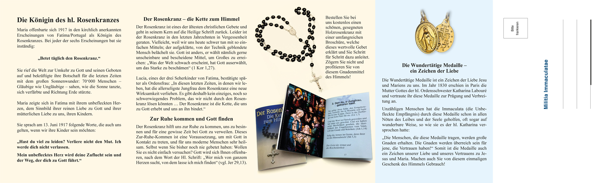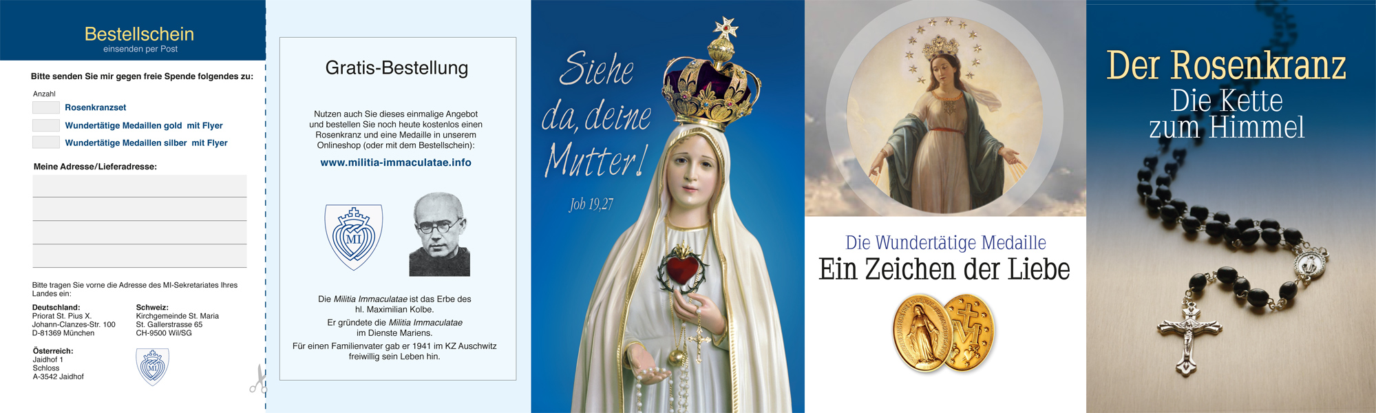 Da man Sakramentalien wie die Wundertätige Medaille oder den Rosenkranz nicht ohne die Zustimmung des Empfängers in einen Briefkasten einwerfen oder verschicken darf, bieten wir einen Briefkastenflyer an. Dieser stellt dem Leser den Rosenkranz und die Wundertätige Medaille vor und bietet ihm an, diese bei uns zu bestellen. Zu diesem Zweck enthält der Flyer einen Bestellschein, den man an das MI-Sekretariat einschicken kann. Alternativ wird auch auf die Möglichkeit der Bestellung im Onlineshop hingewiesen.