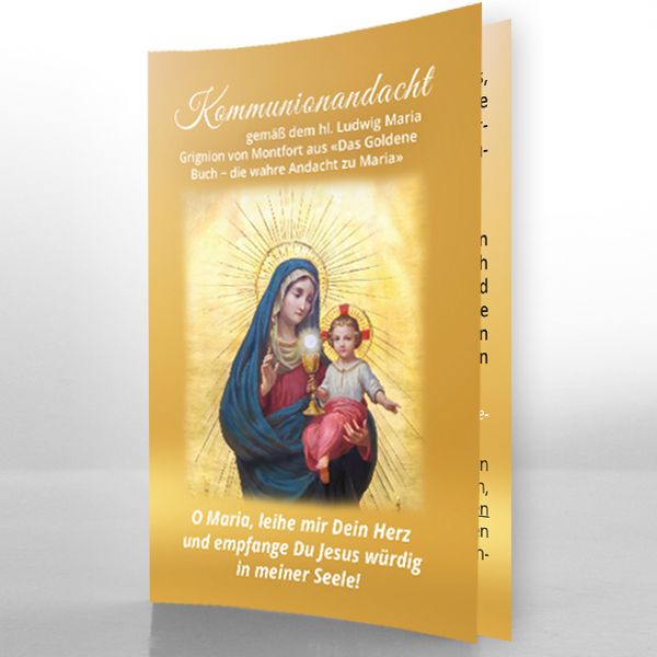 Der hl. Ludwig Maria Grignion von Montfort beschreibt im «Das Goldene Buch» sehr ausführlich wie wir die wahre Andacht zu Maria auch beim Empfang der heiligen Kommunion anwenden können. Die wichtigsten Gedanken / Gebete vor und nach der hl. Kommunion haben wir in diesem Faltblatt zusammengefasst.
