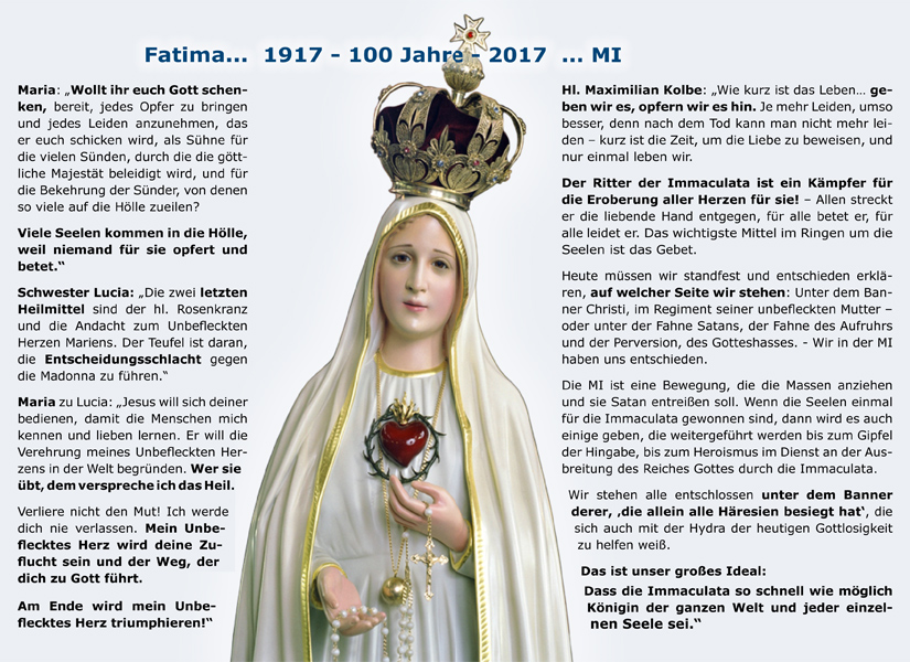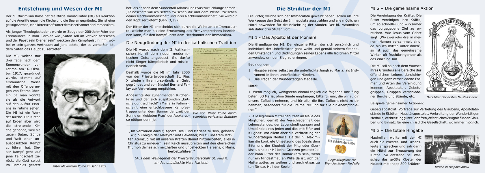 Dieses Faltblatt dient der weiteren Verbreitung der MI. Es stellt die MI vor: die Entstehung, das Wesen und die Struktur der MI. Zudem möchte es anlässlich der 100-jährigen Jubiläen von Fatima und MI deren Übereinstimmung und geistige Verbundenheit aufzeigen.