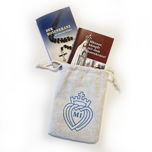 Die Rosenkränze werden in einem robusten Leinenbeutel mit aufgedruckten MI-Emblem geliefert, in welchem auch unsere Rosenkranzbroschüren Platz haben.