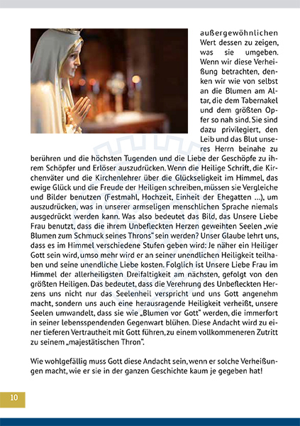 Unsere Liebe Frau von Fatima sagte am 13. Juni 1917 zu Lucia, einem der drei Hirtenkinder: „Jesus möchte sich deiner bedienen, damit die Menschen mich kennen und lieben. Er möchte in der Welt die Verehrung meines Unbefleckten Herzens verbreiten. Jedem, der diese Verehrung bereitwillig annimmt, verspreche ich das ewige Heil. Diese Seelen werden Gott lieb sein wie Blumen, die ich selbst zum Schmuck seines Throns hinstelle.“