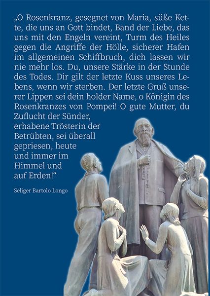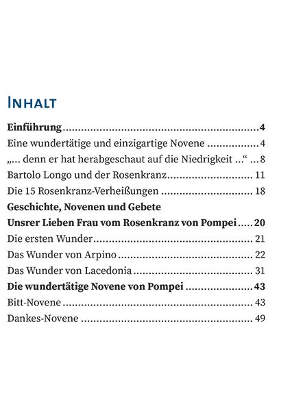Diese Broschüre enthält die Originalfassung der wundertätigen Rosenkranznovene von Pompei, welche auf den seligen Bartolo Longo zurückgeht. Die MI hat dazu eine Originalausgabe von ihm übersetzt und mit einer Einführung ergänzt.
